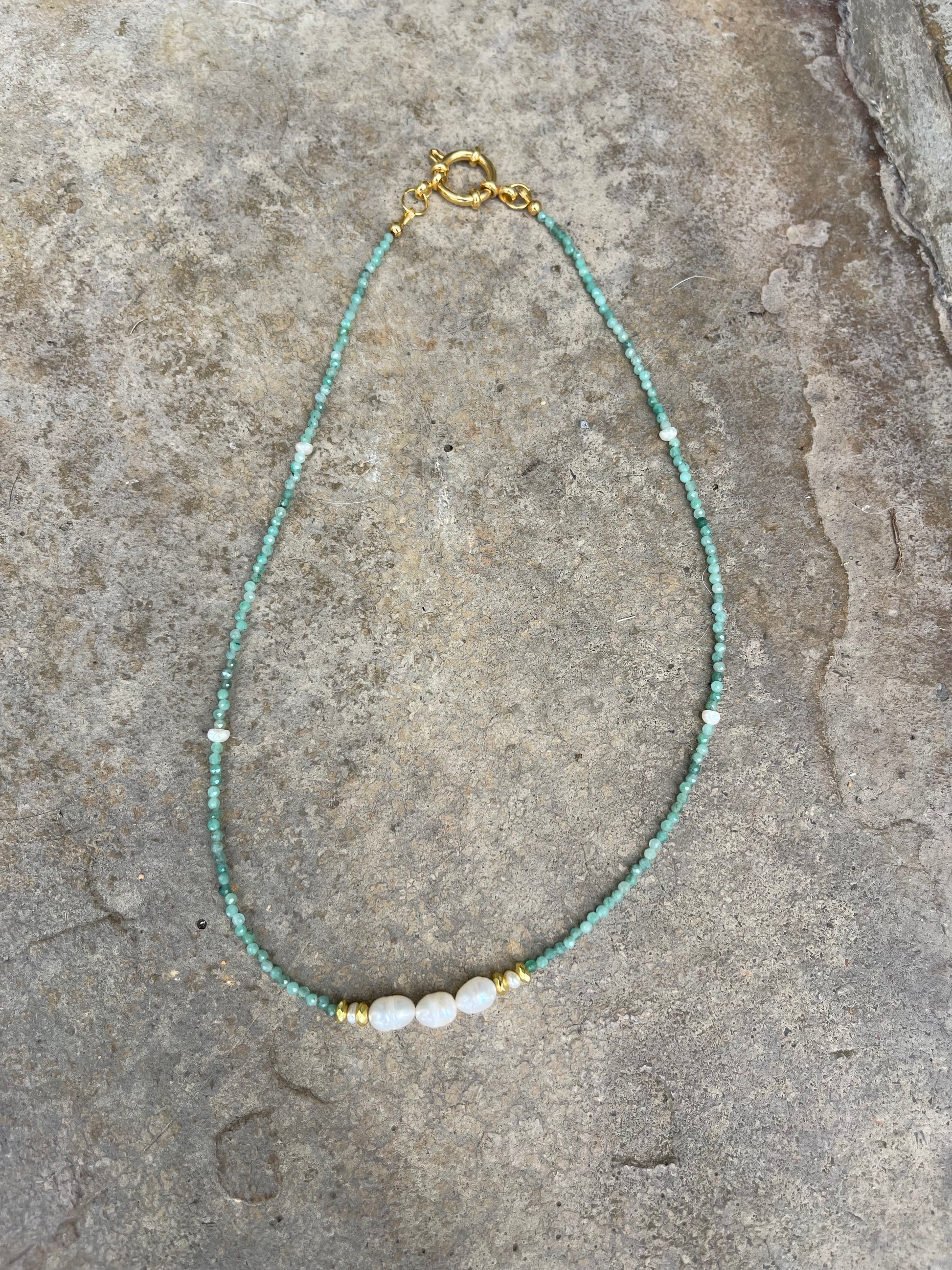 High quality 2mm emerald beads paired with fresh water pearls and 18k gold hematite. Fastened with gold plated clasps.