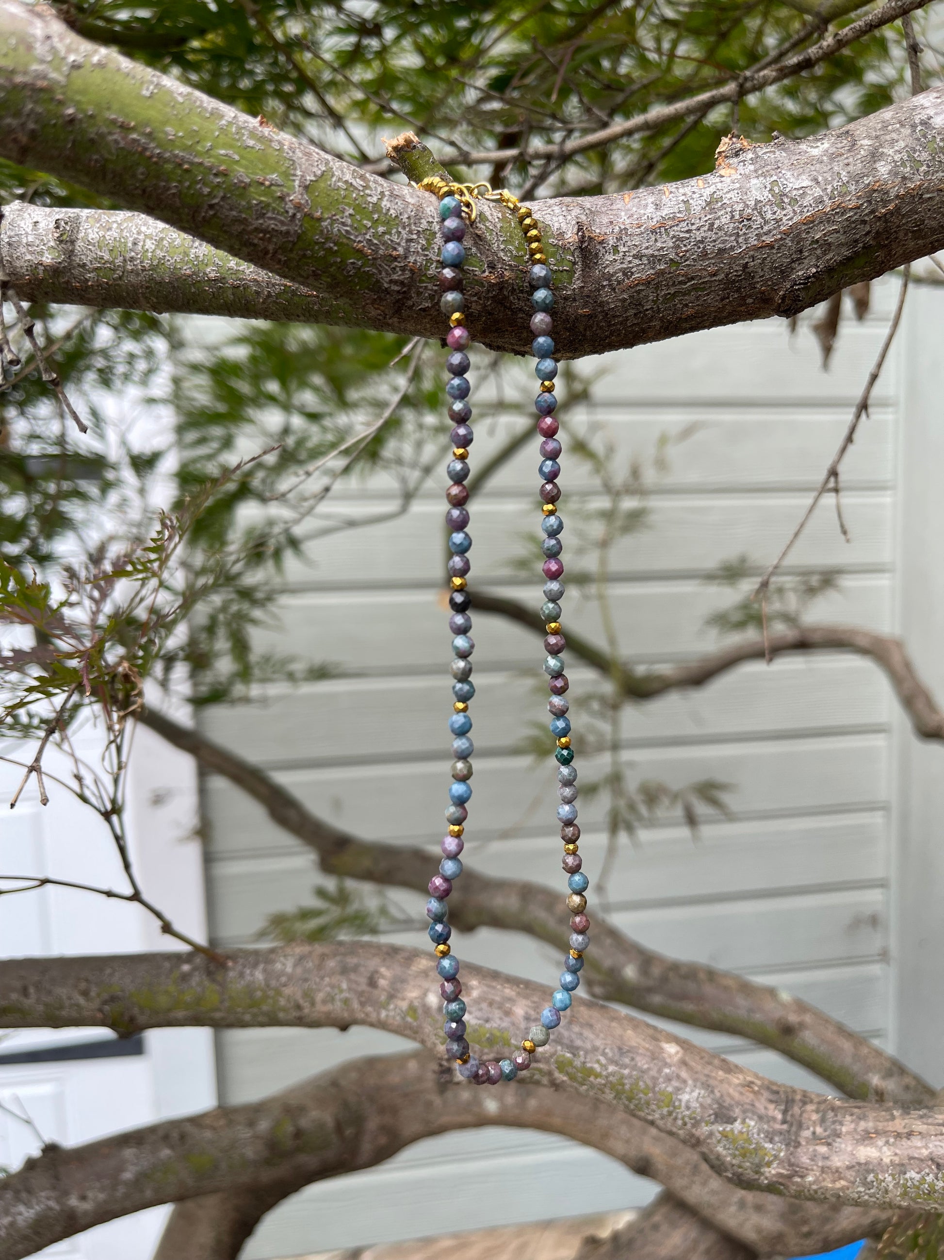 This piece is made of Ruby Kyanite Fushite beads and gold plated hematite. Simple, dainty, and elegant.